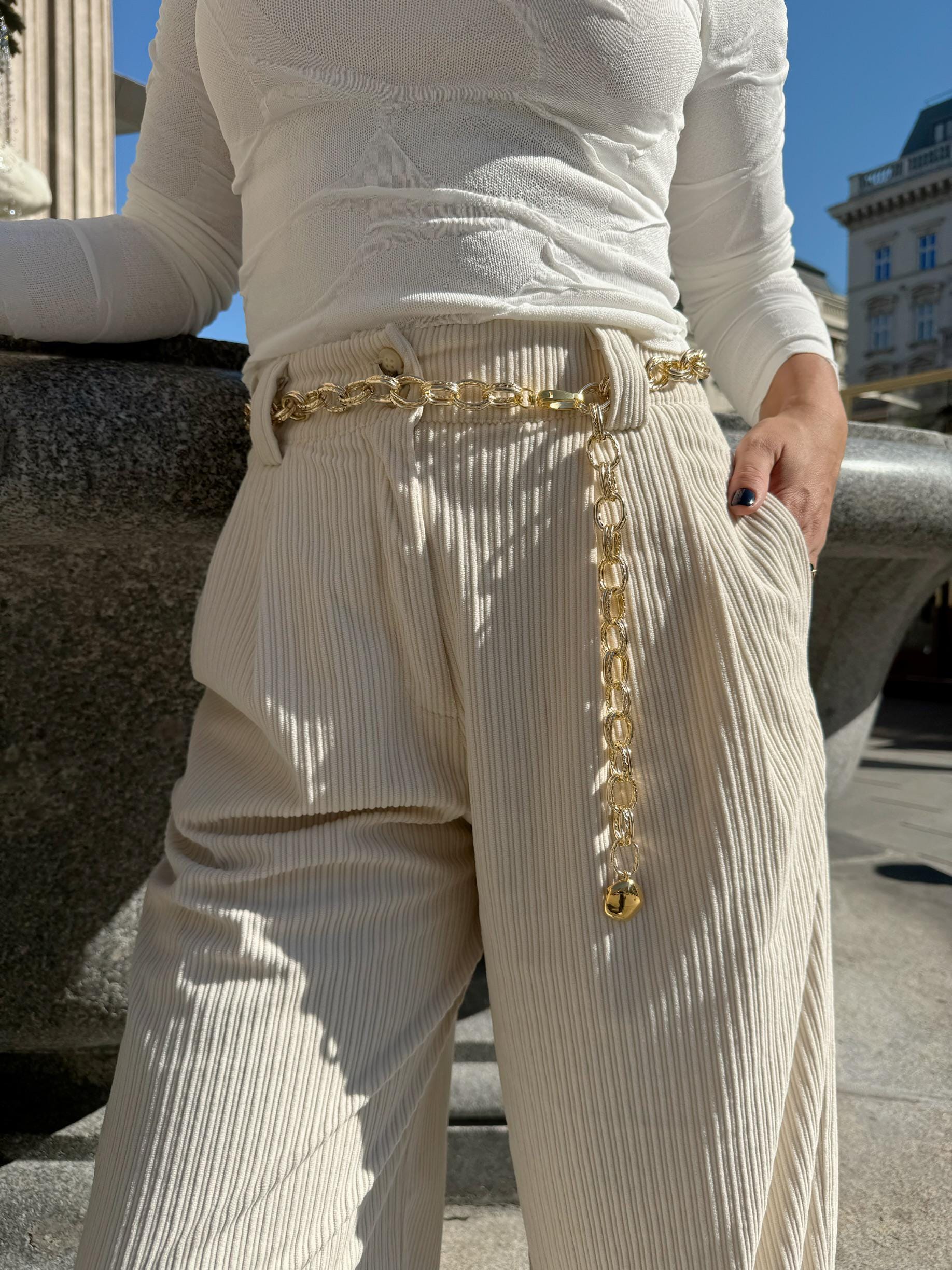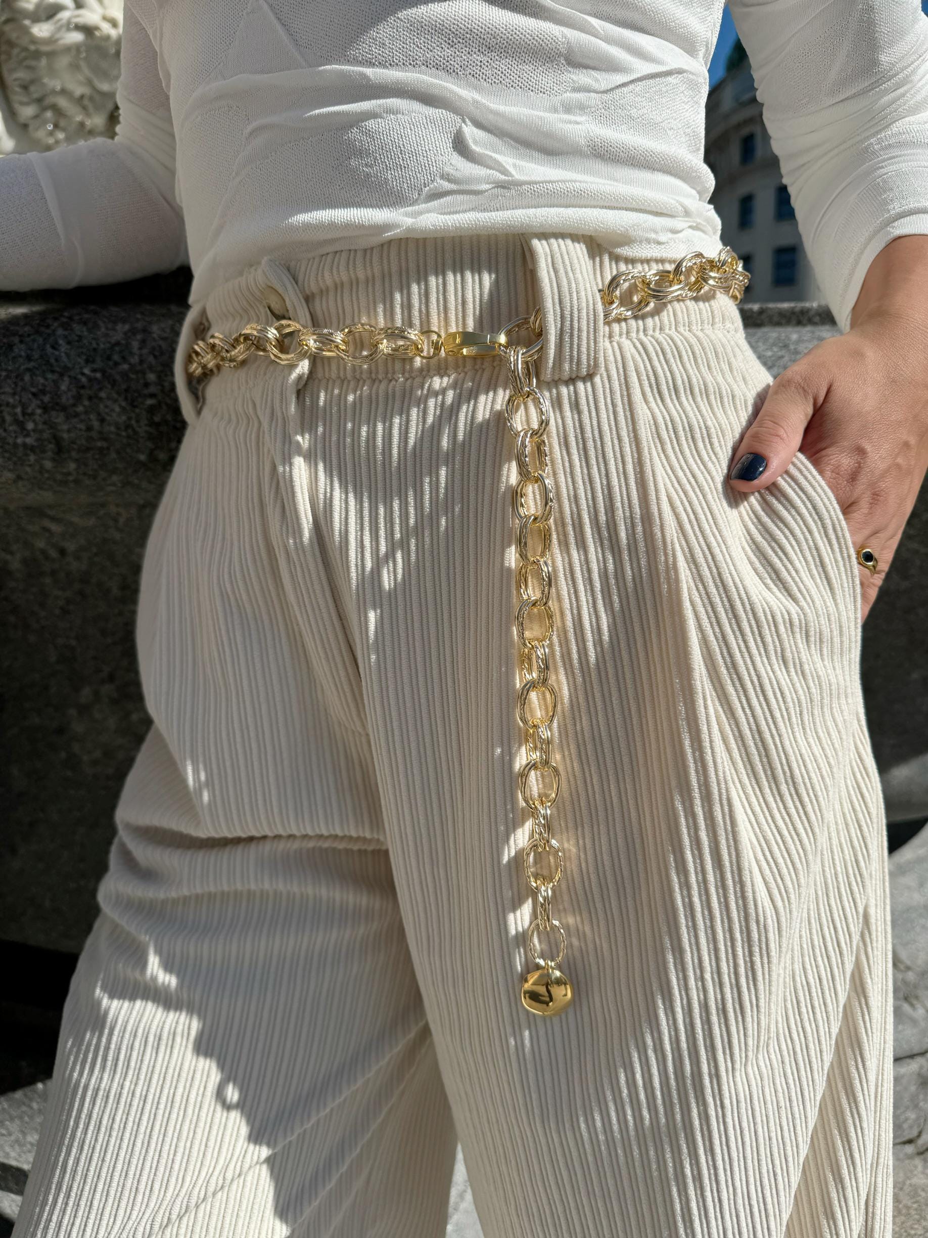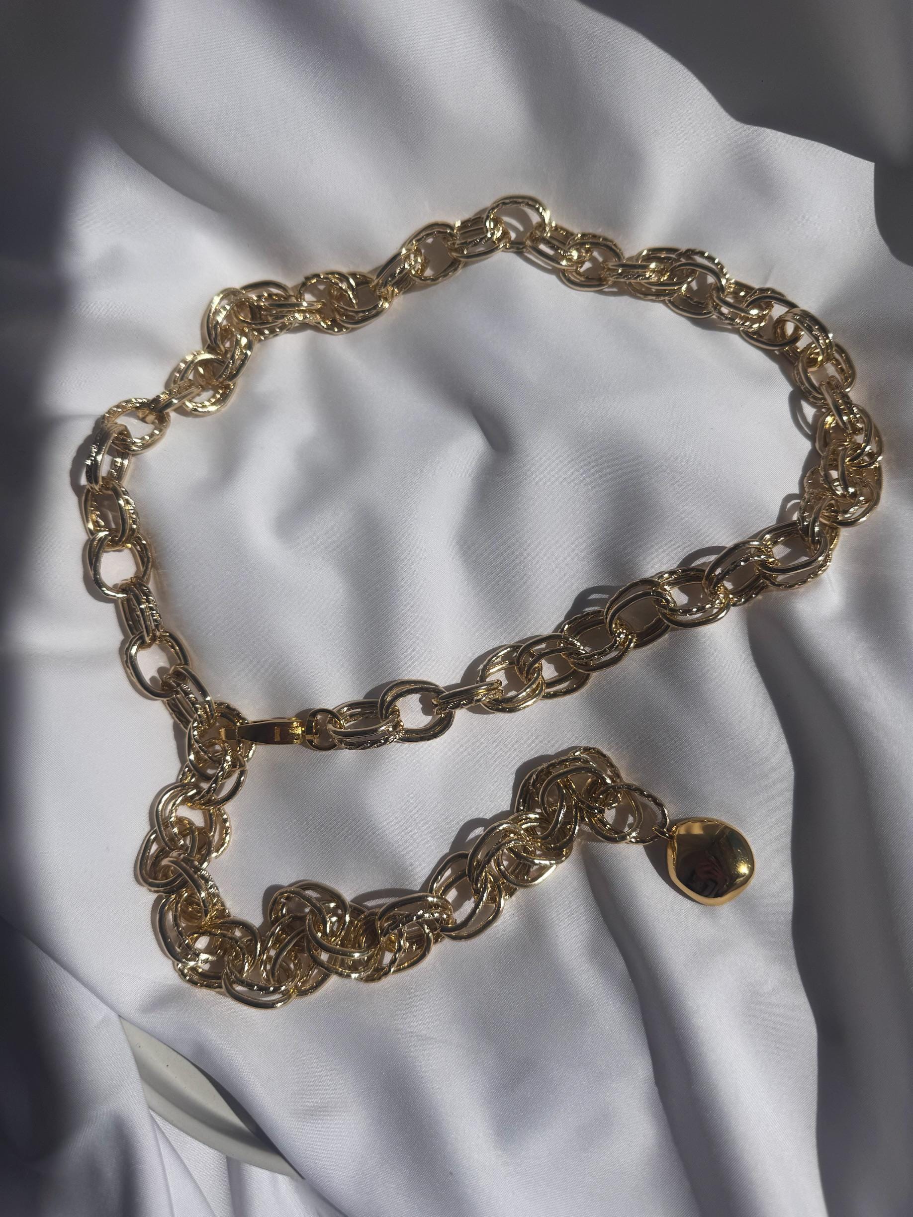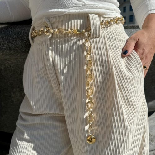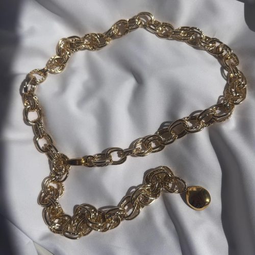 I crafted a new handmade belt using gold-colored aluminum chain adorned with a unique bombe charm, adding a boho flair to this one-of-a-kind piece. The chain design resembles two interconnected loops, creating a truly distinctive final look. The belt chains are used for decoration and they can not fasten pants. (THE DIMENSIONS YOU CHOOSE REFERES TO THE LENGTH OF THE BELT NOT YOUR WAIST SIZE – MEASURE THE POINT YOU D LIKE TO WEAR IT AND ADD 15-20 CM FOR THE SIZE YOU SHOULD SELECT AND LOOK LIKE THE STYLE OF THE PHOTO)