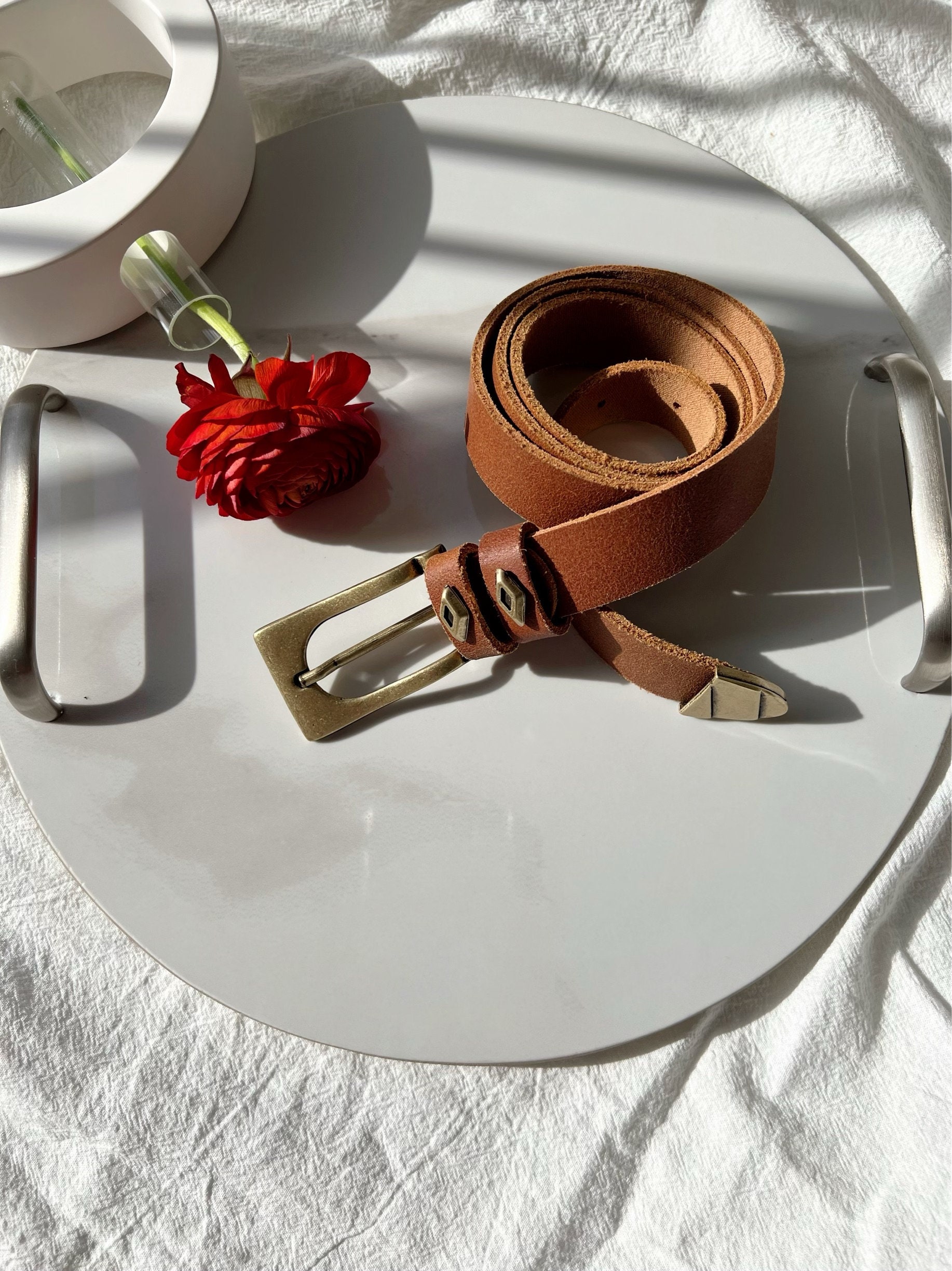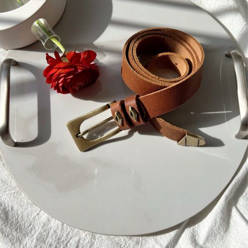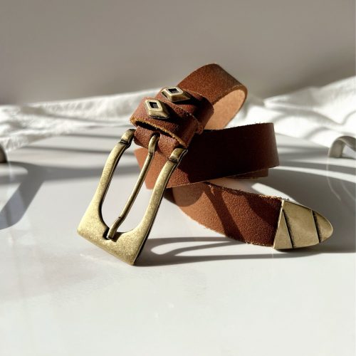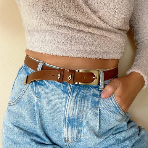 My latest Leather Belt is named ”Thin Blondie” and is a handmade leather belt that is made from real genuine leather in brown color. At the center of the belt, I use a rectangular bronze buckle, and I also decorate the loops and the edge of the belt with special buckles of the same color. The result is a thin belt. Choose the ideal length for you between 8 different dimensions. (THE DIMENSIONS YOU CHOOSE REFERES TO THE LENGTH OF THE BELT NOT YOUR WAIST SIZE – YOU CAN MEASURE YOUR WAIST AND ADD 10 – 15 CM IN ORDER TO CHOOSE THE IDEAL LENGTH). Find it only at us Store.