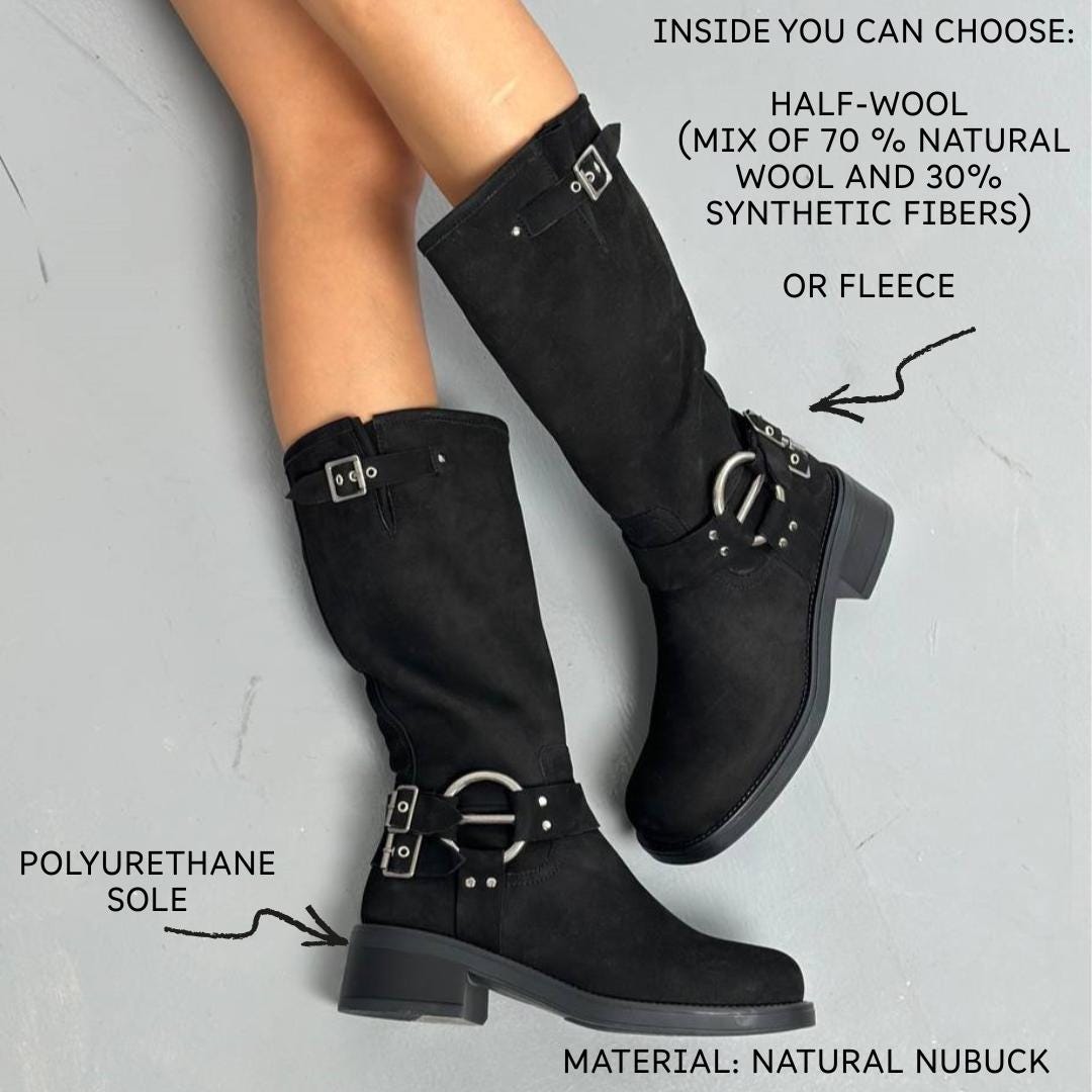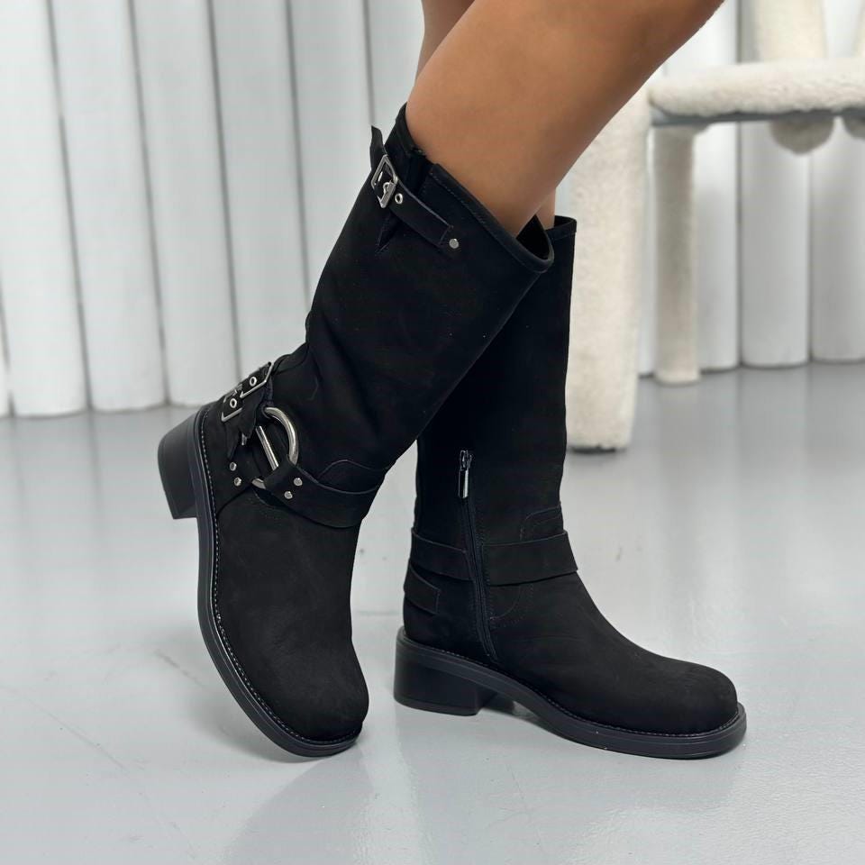 Step out in style with these women s Western nubuck boots, crafted from genuine leather with a soft fleece or semi-wool lining for cozy comfort all day long. The mid-calf silhouette and vintage harness strap bring a rustic, country-inspired charm, perfect for fall and winter adventures. Whether paired with jeans or dresses, these boots combine authentic Western design with lasting comfort, making them a must-have for any wardrobe that loves timeless, rugged elegance.